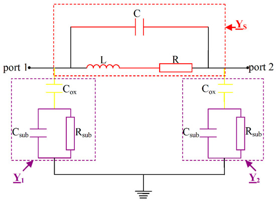 when the port 2 is short circuited; then, due to the symmetry of the oxide layer and substrate geometries, Y ¯ 11 = Y s + Y 1 and Y ¯ 22 = Y s + Y 2 . The admittances of the element represented in Figure 1 are Y ¯ 1 , Y ¯ 2 , and Y ¯ s .