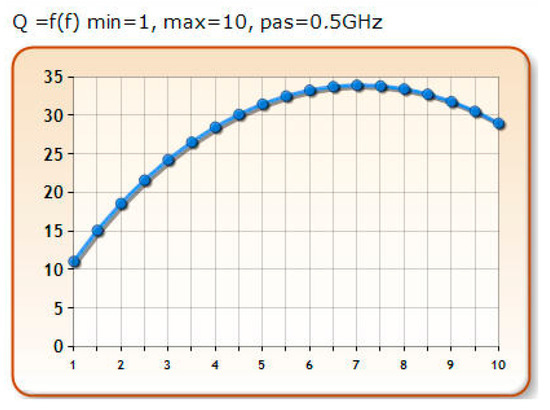 The quality factor variation, in terms of frequency, can also be plotted, directly, in this module of the software. For example, the quality factor is plotted, in terms of frequency, for the square spiral inductor, with 2 turns in Figure 3. The frequency varies between 1 and 10 GHz, with step 0.5. The frequency at which the quality factor is maximal can be found for inductor’s energy efficiency.
