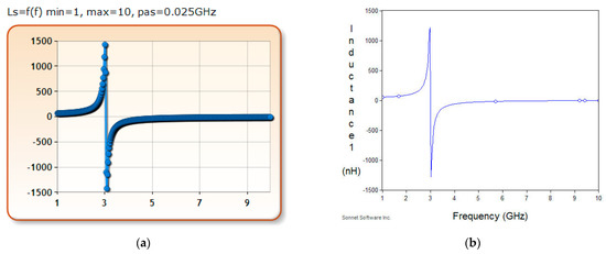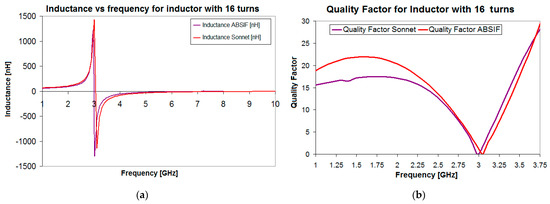For a better visualization of the good agreements of the results, the results for the square spiral inductor with 16 turns were plotted separately in Figure 4, those obtained with ABSIF in Figure 4a, and those with Sonnet in Figure 4b for the same frequency variation between 1 and 10 GHz.
