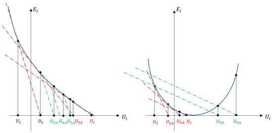 The main idea of the IILC is to estimate the inverse model from the viewpoint of the Newton method, as shown in Figure 2. From the Newton method, the input and output relation of the system can be expressed as a gradient. The green line in Figure 2 shows that the value of the gradient representing the model is the same for each iteration in the process of updating the input of the next iteration from the result of the previous iteration. It does not reflect the slope value required for each iteration for the convergence of the error, and it results in divergence in the right for Figure 2. On the other hand, in the right figure, the red line slope changes at each iteration. With this, a new inverse model by reflecting each iteration’s input/output value could be established. It is possible to account for the parameter-varying system at each iteration with the acceptable convergence speed, as shown in the figure.