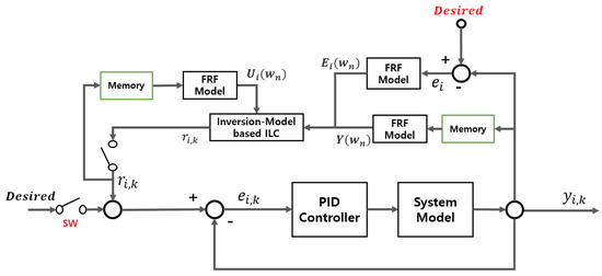 denotes the inverse discrete Fourier transform operator, learning gain, the error, k the index for discrete data. In general ILC practice, the learning gain is normally selected based upon users’ experience. The higher gain does not guarantee faster convergence speed or convergence quality. Although it is a highly complex task to expect the error dynamics, some successful studies are available for the gain selection for a specific task [33]. In a SISO system, the inverse model is calculated using the inverse of the slope, but it is not easy to estimate the inverse model in the same manner in the MIMO system. It can make the update scheme more complicated, especially as the number of axes increases. Therefore, this paper proposes an algorithm minimizing the effect of the coupling term of the MIMO system and viewing it as a set of parallel SISOs by the power of IILC. Through this application, the MIMO system can be easily synchronized and controlled. Through the considering the parallel SISOs, Equation (4) can be regarded as a diagonal matrix, and as a result, the following update law can be derived. The full procedure of IILC is provided in details in Figure 3.