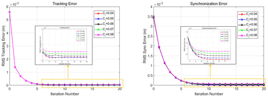 From Figure 8, it can be confirmed that the RMS error converges monotonically for tracking and synchronization. The proposed inverse model shows superior convergence speed and accuracy compared to other methods. When the number of iterations is 5–6 times, the tracking error has already reached the steady state, and the synchronization error also approaches small values. Even when comparing the results by applying other existing ILC algorithms, it can be confirmed through Figure 9 that the proposed method shows better convergence. The conventional IILC also shows fast convergence speed with reasonably acceptable accuracy. However, it can be seen that the performance is worse than the proposed algorithm since it has limitations for handling the iteration-varying factors such as time-dependent friction. In the case of P-type ILC, it is clearly seen that the convergence speed is slow with worse accuracy.