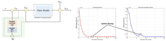A typical basic structure of the ILC is P-type ILC. Although it has simple formulation and implementation with acceptable accuracy, it has a notable disadvantage in convergence speed, along with many other ILC methods [26,27]. To overcome the drawback, the inversion-based ILC (IILC) has been proposed and tested [28,29,30,31]. It features a much faster convergence speed than the P-type and shows high convergence when selecting an appropriate gain. However, the limitation of IILC exists in the derivation process of the inversion model. It is not easy to derive an inversion model, and if the accuracy of the inversion model is not precise enough, the convergence will be rough. In addition, from the viewpoint of the Newton method, it is difficult to obtain the desired performance in the iteration-varying system or nonlinear system because previous studies used a fixed gradient in the iteration axis [32]. To compensate for these problems, this paper proposes a method to control tracking and synchronization through IILC based on the Newton method, which applies reformulation of the model at each iteration with simple inversion.