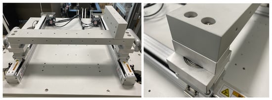 To test the performance of the proposed control algorithm, two systems were used. A generic dual-actuator gantry was built for preliminary tests of the present work. Then, the method was applied to a multi-probe wafer inspection cartridge transport robotic system which is driven with a pair of actuators. The gantry testbed is shown in Figure 6. Three experiments were conducted using this test setup. First, an experiment to verify the controller’s primitive performances on the dual-drive mechanism was conducted. This might be a basic test to confirm the paralleled SISO iterative learning controls when applied to a dual-motor system. Second, as shown in the simulation, the system parameters were changed while the iteration proceeded. The convergence performance of the designed method should be checked, and its steady-state error is to be verified. Lastly, to check its limitation, a challenging test setup that aggravates the mechanical coupling of the two actuators was built, and the proposed method was applied. Finally, the method was applied to a multi-probe wafer cartridge transportation system and its control accuracy was checked. The hardware for the experiment was configured as shown in Figure 7.