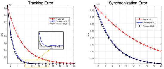 Figure 14 shows time-domain data of the position tracking and the synchronization at the 20th iteration. In the case of synchronization error, it can be confirmed that the maximum error is within 10 um. In addition, the comparative study of RMS errors is showed in Figure 15. The proposed ILC provides superior RMS errors for both tracking and synchronization. It also confirms that the proposed method, a parallel SISO IILC controller, works well for the multi-actuator synchronization problems. Although this paper tries to prove that the parallel SISO IILC control works well for the multi-actuator system, it has been verified with limited physical systems consisting of linear motions. However, it is believed that few differences should be discovered when applied to multi-motor rotary motion machines in heavy payload operations.