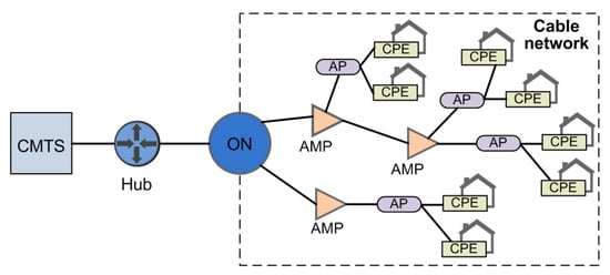 HFC (Hybrid Fiber–Coaxial) networks evolved from traditional cable TV networks to offer their users a broader spectrum of services, i.e., triple-play service (voice, data, video). HFC networks employ DOCSIS (Data over Cable Service Interface Specification) standards. The DOCSIS 3.1 supports 10 Gbps downstream and 1 Gbps upstream []. DOCSIS 4.0 will support even higher capacities and full-duplex transmission []. Thus, HFC networks can offer high-quality broadband access to their users.