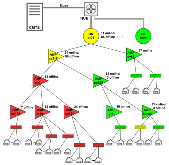 Figure 3 shows an example of failure localization. Red color shows that all CPEs under such devices are offline. Green color shows that all CPEs under such devices are online. Yellow color shows that there are both online and offline CPEs under such devices. Tree topology makes it easier to detect the root of the problem. It is the top device under which all CPEs are offline. In the given example, the amplifier AMP_ng2 is the point of failure. AMP_as218 is not the point of failure because there are online CPEs beneath it.