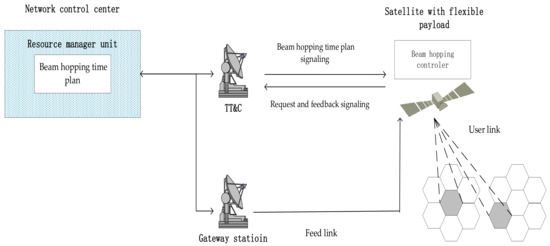 This paper considers the forward link of the multi-beam geostationary satellite systems, where broadband services are transmitted from the gateway station (GW) and transparently forwarded by the satellite to user terminals, referring to the DVB-S2X standard. Regarding the beam hopping architecture, the system resource management unit is within network control center (NCC). It pre-generates the beam hopping time plan (BHTP). BHTP determines dwell time and illumination order of each beam to match the traffic demand. The satellite receives the BHTP signaling message via telemetry, tracking, and command (TT&C) [2,26]. Then, the onboard beam hopping controller resolves BHTP and activates corresponding beams by employing a switching matrix or beamformer [27,28].