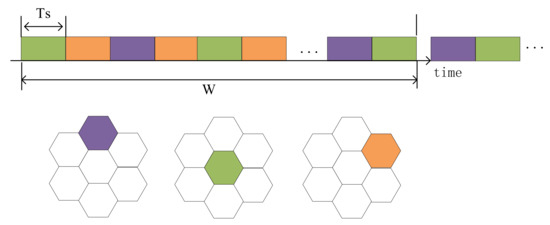 As shown in Figure 2, the BHTP consists of multiple beam hopping periods Tw, which are periodically repeated. The duration of one time slot is Ts, which is the smallest time resource scale. Thus, , where W represents the number of time slot in one beam hopping period. Moreover, dwell time represents the length of continuous time slots allocated to a beam.
