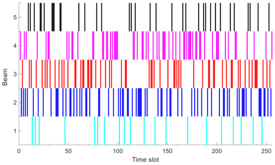 As previously stated, time-varying rain attenuation brings changeable spectrum efficiency for each beam, which makes the quantity and arrangement of beam hopping time slots become coupled. By employing GA as a global optimization method, the dynamic allocation algorithm is proposed to solve the nonlinear problem with multiple constrained conditions. It can obtain not only the number of time slots allocated to each beam, but also the arrangement of time slots in the beam hopping period to determine the order in which the beam is activated. The time slot allocation results of one period for each beam are shown in Figure 7, where the X-axis represents time slot index and the color-block represents the time slot allocated to corresponding beam.