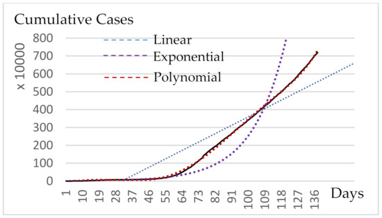 By implementing regression analysis, which is explained in the chapter [32] and further analyzed in the article [33], we construct linear, exponential and polynomial interpretive models, as shown in Figure 1, for the cumulative infectious cases of daily reports since 31 January 2020. In addition, the least-squares method enables the calculation of the coefficients for Equations (1)–(3):