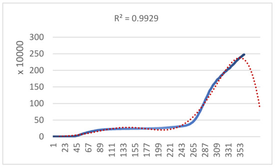 As shown in Figure 10, since 16 October (day 235), we observed considerable acceleration as the curve displays rapid increasing progression. As observed, the red dashed curve represents (18), which is the trendline that is derived from the implementation of the curve adjustment to predict the extension for 20 days. Evaluation through the coefficient of determination presents that the regression predictions approximate the real data points with a fitting accuracy of R2 = 0.9885.