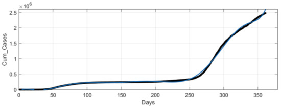 At MATLAB’s Curve Fitting Tool, we implemented a ninth-degree polynomial for curve fitting corresponding to Italy’s cumulative infectious cases. As a result, we generated the curve shown in Figure 4 interpreted by (11) where x is normalized by mean 181 and std 104.4, and the coefficients’ (with 95% confidence bounds) goodness of fit results are presented in Table 3.
