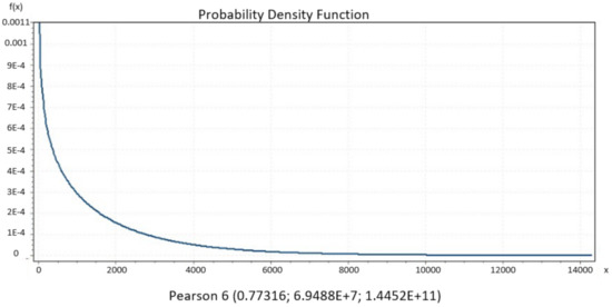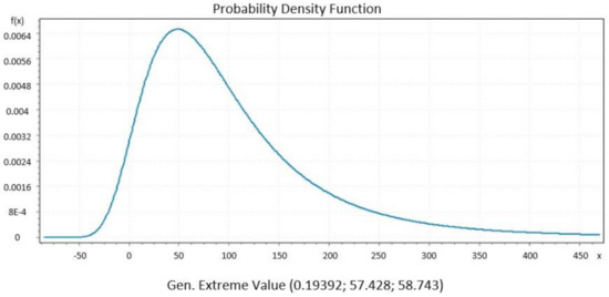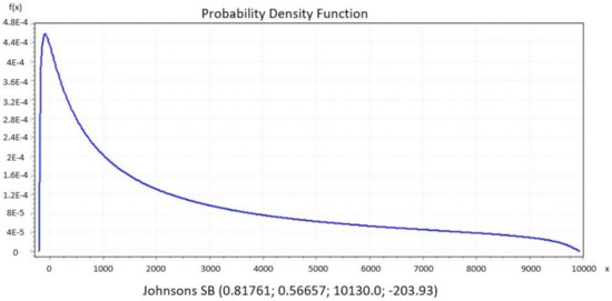 Figure 5, Figure 6, Figure 7, Figure 8 and Figure 9 present the distributions Johnsons SB, Gen. Extreme Value, Person 6 and Degum as the best performance of goodness of fit for Italy, Czech Republic, France and Denmark, respectively, and they were evaluated by Kolmogorov Smirnov and Anderson Darling tests. Johnson SB distribution shows the best fitting performance compared to the other distributions in two countries, Italy (Figure 5) and Spain (Figure 8) [36]. From the iteratively weighted approach in section zero, the distributions fit the curve better than without weight.