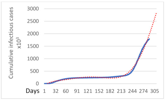 where x denotes the days from the initiation of the pandemic, and y denotes the cumulative infectious cases.