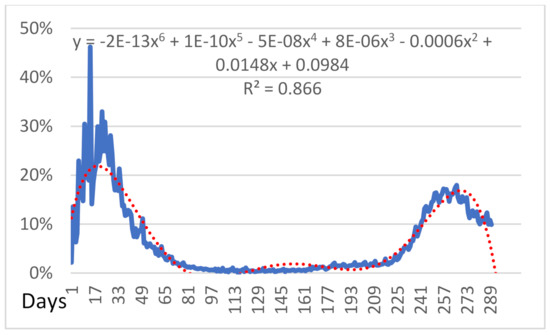 We evaluated the percentage of infected cases over the number of daily conducted tests during the same period and presented the generated results graphically in Figure 11. As shown, the two schemes conclude to dissimilarities due to the curve’s progress and the inferences. The curve in Figure 10 can be observed, and it changes the concavity from upwards to downwards and presents increasing progress since 06 October, day 225. More specifically, the contradiction occurs due to the rapidly growing growth of the curve in Figure 11 and the slow acceleration of growth in Figure 10. The second wave’s maximum point appears to be lower than in the first wave of the pandemic. The forecast for 20 days shows that the trendline’s function (18) with R2 = 0.866 is decreasing within the interval [273,289] in contrast to the previous Figure 10 where the rapid increment in the interval [235, ∞) is presented.