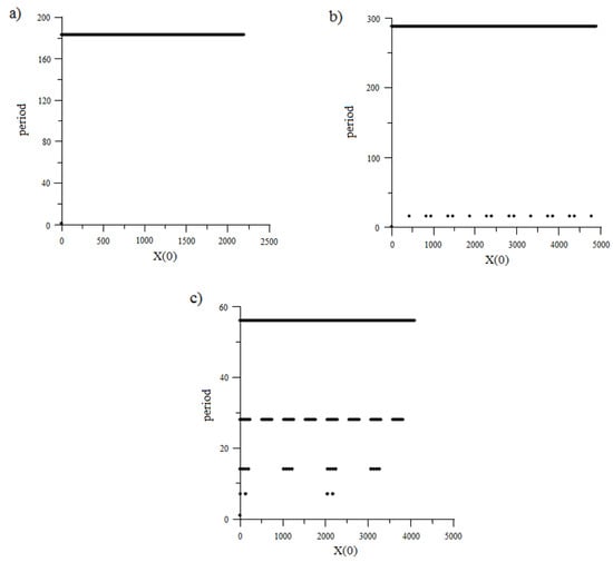 Figure 2 shows the dependences of the repetition periods of the studied pseudorandom numbers sequence generators on the value of the key X(0).