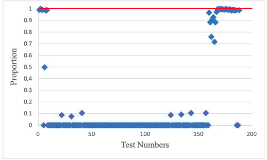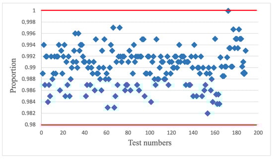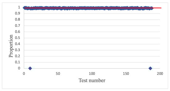 Research of the statistical characteristics of the output pseudorandom bit sequences of new AFGs were carried out with NIST tests package []. If the proportion fell outside of this interval (0.98–1.0), then this was evidence that the data were non-random. Testing was carried out at different values. As a result, the sequence was entirely non-random, so requirements of statistical security were not accepted. For example, Figure 3 presents a statistical portrait of the output sequence at m = 2,147,483,647.