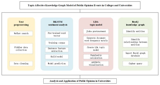 In summary, scholars have conducted many studies and achieved many results in the fields of the sentimental knowledge graph and topic analysis of university pandemics, but few scholars have applied the above two analysis methods to the study of university pandemic public opinion. In addition, the analysis of public opinion in universities lacks a comprehensive consideration of the characteristics of various aspects of university public opinion groups. In this paper, we use the sentiment analysis model BiLSTM_LSTM and the LDA topic model to experiment with public comment data from representative, official university WeChat accounts and import the experimental results into the Neo4j graph database to build a topic–sentiment knowledge graph. The integration application of university public opinion and knowledge graph is realized, making the sentimental knowledge graph an effective means of data mining and knowledge discovery in university knowledge management. It provides certain guidelines for the public opinion supervisory department to understand the control points, evolutionary trend analysis, emotion guidance, and monitoring tools of public opinion in colleges and universities events; it has certain theoretical and practical guidance significance to promote the construction of a university network public opinion monitoring platform.
