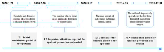 To achieve the refined event evolution analysis described in this paper, the study phase was divided into four key periods based on Fighting covid-19 China in action [27] (T1: “Initial containment period of the pandemic” from 21 January to 20 February 2020; T2: “Important effectiveness period for pandemic prevention and control” from 21 February to 17 March; T3: “Consolidate the effective period of the pandemic” from 18 March to 28 April; T4: “Normalization period for pandemic prevention and control” from 29 April to 31 December), as shown in Figure 2.