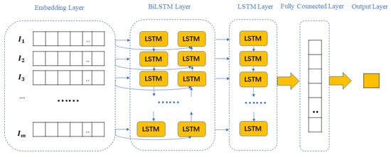 RNN has achieved remarkable results in processing continuous data for sentiment analysis, but its gradient disappearance problem makes it extremely problematic in several aspects similar to efficient learning and tuning hyperparameters. The LSTM, on the other hand, is a special recurrent neural network designed to address the long-term dependence of RNNs by adding memory units to each unit of the hidden layer making the memory information in the time series controllable and better able to predict sentiment through the neural network [29]. On the other hand, BiLSTM is useful in scenarios where input context is required, especially for tasks such as sentiment classification. In BiLSTM, information flows not only from back to front, but also from front to back using two hidden states. This allows the learning capability of the LSTM to be further improved to better understand contextual information [30,31]. Considering that the advantage of LSTM is that long-term memory functions can be achieved by connecting previous and present contexts, the advantage of BiLSTM is that past and future contexts can be extracted by considering both directions of the information flow [32]. Based on this, this paper proposes to add a bidirectional LSTM network to the LSTM network and use the BiLSTM_LSTM model for training and the prediction of sentiment analysis. The parameter information of the model is shown in Table 1 and the architecture is shown in Figure 4: It consists of a word embedding layer, a BiLSTM layer, an LSTM layer, a fully connected layer, and an output layer. The following is described in detail.