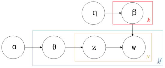 In Figure 6, represents the number of documents, represents the number of words per document, and represents the number of potential topics. There are non-repeatable terms in the vocabulary; there are documents , , …, in the corpus, which is composed of repeatable words; there are topics , ,…, in the corpus. and are the parameters of the prior distribution; is the topic distribution for each document; for the th document , under the topic distribution , the topic can be determined; is the word distribution for each topic; the selection of from indicates that the term is determined from the word distribution , resulting in the observation .