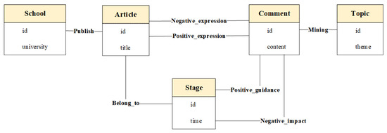 Scholars have conducted extensive research on university student populations in the context of COVID-19, focusing on “education” and “psychology”, such as studying student satisfaction with the quality of videoconferencing during the pandemic [8] and exploring the impact of the pandemic on college students’ academic performance and social mood [9]. Fewer studies have been conducted from the perspective of public opinion analysis. Secondly, in China, scholars have mostly conducted qualitative analysis on public opinion in universities during the pandemic [10], and there are few quantitative research results. Again, analysis of university public opinion through sentimental knowledge graphs, which is an innovative study in the current period of the pandemic explosion, is studied even less by scholars.