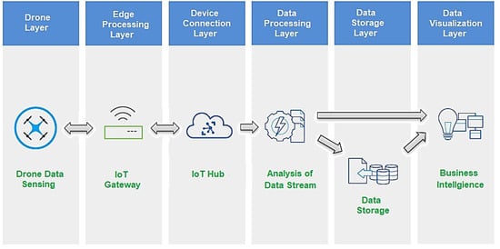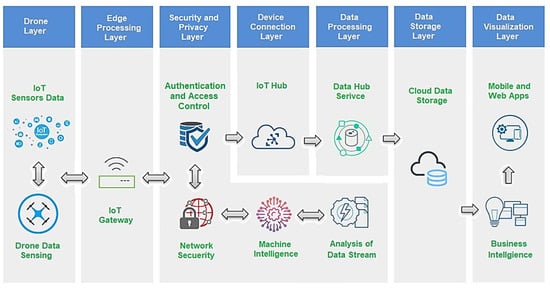 A layered architecture [], as shown in Figure 2, that is typically used for smart drones is updated by adding a security and privacy layer and updating the data processing layer with machine intelligence components.