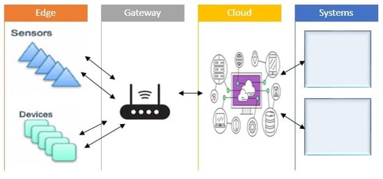 In the second layer—the edge processing layer—the drone and IoT raw data are forwarded to the security and privacy layer, where it is verified that the data originate from authenticated devices. This layer deals with the communication and transmission of data to the next station; i.e., the cloud layer. Several gateway device mechanisms are available which provide wireless communication. Wi-Fi communication transmits information at a fast speed. The edge processing layer provides device to cloud communication efficiently. This layer is responsible for data protection, cashing, and flooding. The proposed research uses the Azure IoT gateway for cloud communication. The architecture of the IoT gateway is shown in Figure 3.