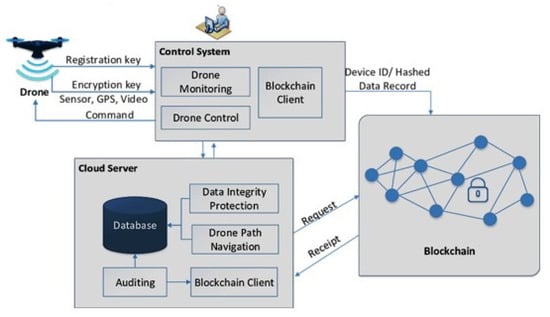 In a typical layered architecture [] of industrial drones, the drone layer is the first layer, where a quadcopter or other mini drone has a camera attached to it. This drone is attached to an IoT hub through an IoT gateway. Here, IoT gateways play an important role in providing communication; for example, a cloud-based IoT Hub of a base-station. The data received at IoT Hub is further passed to the data processing layer to investigate the data stream of the drone. The results of data analysis are stored in data storage centers at the data storage layer, and data are streamed to the data visualization layer, which visualizes the drone data analytics. This platform can be used in Microsoft’s Azure services for cloud storage and Hub services. However, a problem with such a platform is the lack of support for cybersecurity and data privacy. The Internet of Drone Things (IoDT) [] is another recent idea that introduces the use of IoT with drones, allowing drones to connect with an IoT network. In this research, the idea of the IoDT is proposed along with security and privacy concerns. The proposed work proposes the use of the IoT with drones to obtain smart drones that have decision-making ability, and we use blockchain technology to make these smart drones secure and private.