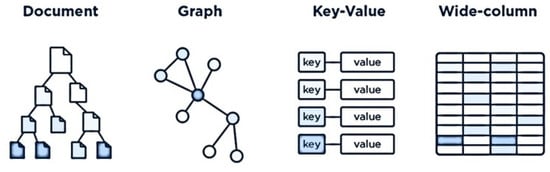 The results of the data analysis generated by the data processing layer are stored in the data storage centers at the data storage layer. A cloud-based NoSQL database is used for the storage of results generated by drones in the drone layer. The data consist of IoT sensor data along with network and drone information. The NoSQL database provides the schema-less storage of information, making it easy to access and retrieve data quickly. A large volume of data can be stored with this technique. A NoSQL databse is a self-referential database, which makes it more useful than SQL databases. Figure 5 shows the common storage structures that are used in such databases. A document structure, graph structure, key–value structure, and column structure are shown, which are the most used structures.