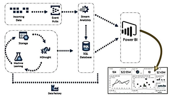 The data visualization layer allows data monitoring using several tools and services. Microsoft Azure services for storage services and hub services are used in this platform. A mobile app is used to view the results generated by the visualization layer, showing the predictions made by our intelligent model about the security level of a drone. Drone attacks are identified using the intelligent Naïve Bayes model. Figure 6 shows the architecture of how business intelligence works using stream analytics results, which are stored in a storage center. These results are used by Power BI, which is a platform for business intelligence modeling and result visualization.