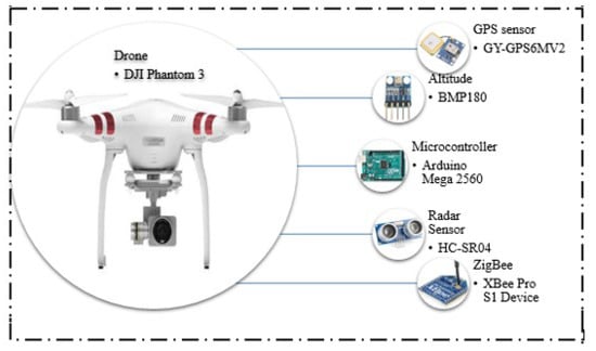 Unmanned aerial vehicles (UAVs) are air-bound vehicles without human operators. Typically, UAVs are used by aerodynamics forces to provide the forces with the facility of remotely piloting a machine []. There are similar commercial applications as well, which have caused a change in the behavior of many industries and have had an impact on day-to-day life. Since drones are typically capable of collecting aerial data and transmitting these to their base station with ease, this feature makes drones a convenient vehicle for surveillance and monitoring purposes []. However, the rapid growth in the use of drone technology in our daily life has brought challenges not only in terms of drone safety and security but also privacy, liability, and regulation in particular []. There are so many advantages of small-size drones in agriculture, industry, shipping, delivery, etc., that these drones are becoming part of our daily life. However, the security and privacy of these drones are an open challenge []. In recent times, another emerging field of research has been the attempt to make drones smart by adding a few sensors that a small drone may be sufficiently capable of carrying. A set of devices such as sensors, transmitters, and cameras for many different and complex applications can make drones more useful and effective [].