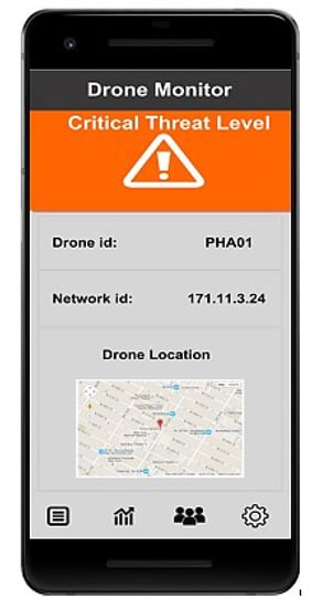 The machine-learning-based research solution for secure authentication and access control for drones and IoT devices is a key contribution of this research. This work aims to fill the research gap by making drones safe and reliable against major cyber-security issues and making them a useful monitoring tool, both commercially and for the industry. As explained in Section 3, the proposed architecture of the drone security system consists of seven layers. Data from the drone layer and edge processing layer are passed through the security and privacy layer before being forwarded to the device connection layer. At the security and privacy layer, data are protected from security threats by deploying machine learning models, where a mobile alert is sent when an attack is identified. Figure 11 shows the mobile alert of an identified attack.