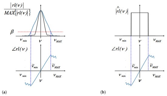 Figure 3. After step 9, , computed only in , is narrowed (blue curve) as compared to the initial one (black curve). - Compute the inverse Fourier transform of the squared current return loss (i.e., of the square of the blue curve of Figure 3):so that the magnitude and the unwrapped phase of are now like the blue curves sketched in the top and bottom panels of Figure 4a, respectively. It should be noted that here we are implicitly assuming that is nonzero only in . By comparing the previous and the current version of , now the magnitude main lobe is wider (this is due to squaring in (7)) and the region where the instantaneous phase is linear wider. In fact, in correspondence with the threshold , two new values of are identified, i.e., such that and . By way of example, if from this step one returned to step 7 and the same step 7 were performed together with steps 8 and 9, the new return loss would be given by the red curve of Figure 5.