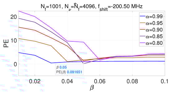 Figure 7 shows the behavior of the percentage error, , as a function of the two thresholds and , with and being the estimated and actual frequency shift (i.e., MHz), respectively. As can be seen, these thresholds have a relatively strong impact on values, being able to notice that they are non-linearly related to . In particular, it can be observed that for the considered cases, the minimum percentage error value is for .