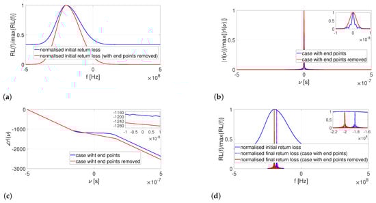 Figure 8 shows the results of applying the algorithm specifically in the case in which . Figure 8a shows both the (normalised) initial return loss (blue curve), given by Equation (8), and the normalised one (red curve) obtained by applying steps 1 to 3 of the algorithm, which has no end points. The magnitudes of the (normalised) inverse DTFTs of these signals are reported in Figure 8b, which shows that they differ significantly from zero over a much smaller interval than the entire observation one μs. These are actually the parts that must be retained. Indeed, it is clear from Figure 8c that in this smaller interval the phase of shows a different slope as compared to the regions where the magnitude of is negligible. Therefore, this justifies why we focus on the main lobe of . Furthermore, it should be noted that if the end points are removed, the function has a different behaviour than that relating to the case in which this removal is not performed, as can be clearly recognised by observing the blue and red curves of Figure 8b,c. In particular, by looking at the inset of Figure 8b, it can be seen that removing the end points allows for a larger interval (which is positive for narrowing the ). In the end, Figure 8d shows the comparison between the initial return loss and the final return losses obtained at the end of the full application of the algorithm, although it must be taken into account that the blue dot sinc-like curve is relative to the case in which steps 1 to 3 are not applied to the initial return loss (blue curve of Figure 8a). In fact, although the final curves turns out to be much tighter than the initial ones; to the blue dot curve corresponds while to the red one corresponds . Therefore, this shows that the removal of the end points turns out to be beneficial from a performance point of view.