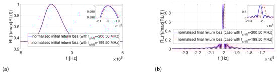 Evaluation of the resolution of the proposed algorithm. (a) Normalised initial return losses with points of maxima equal to −200.5 MHz (blue line) and −199.50 MHz (red line). (b) Corresponding final return losses. The other parameters were set as follows: , , .