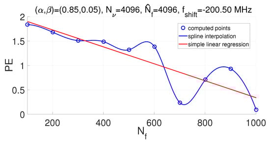 Finally, it is worth asking about the performance behaviour of the algorithm in question when changing the number of initial points, . To do this, let us consider Figure 10, which shows the trend of the percentage error as a function of , again for , , and MHz. Looking at the figure, it can be seen that the number of samples of the initial return loss also impacts the performance in a non-linear way, even if higher values of correspond, in a wide sense, to smaller values of . In fact, this can be confirmed by the negative slope of the linear regression straight line shown in red in the same figure. Furthermore, even if approximately between 600 and 900 samples the difference between the computed values of and the above linear regression straight line is relatively marked, compared with what is obtained for the other values of , it is also true that the computed values of the percentage error after 600 samples starts to drop and then remain below . However, it can also be observed that when goes from 1001 to 101, the performance degradation is still small, as the percentage error does not exceed .
