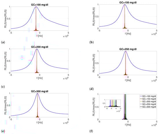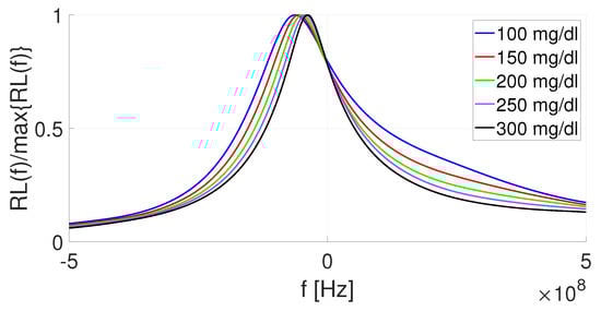 Figure 12 shows the experimental (normalised) return loss measured for the water-glucose solution with different values of the glucose concentration where it can be clearly appreciated how the resonance frequency shifts with .