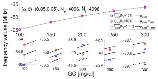 Estimated frequency shift, , sample mean, , and sample standard deviation, , of as functions of the glucose concentration (GC), for .