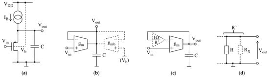 Lossy integrator based on MOS source follower: (a) transistor-level circuit; (b,c) equivalent OTA-C diagrams; (d) modified ladder tail due to the body effect in MOS transistor. R’ = gm/(gm + gmb) (Ω), RX = gm∙R/(R∙gm + R∙gmb − 1Ω∙gm) (Ω).