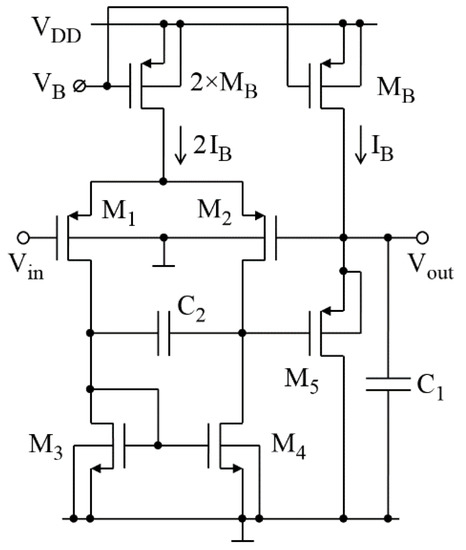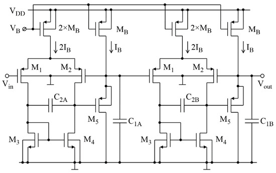 Buffer-based analogue filters are in fact unity-gain amplifiers (i.e., buffers, followers) characterized by a bandwidth that is limited to the required frequency. For example, a simple two-stage Miller operational amplifier can be converted to a filter when it is configured as a unity-gain amplifier by closing a negative feedback loop. In this case, the limited bandwidth is due to Miller compensation, which results in a low-pass transmittance with one dominant pole, i.e., a first-order low-pass filter. Synthesis of a second-order response is also possible, however, only for certain classes of buffers—for instance a few variants of source followers including undamped [1,2], super [3], flipped [4,5,6], and ones that belong to other classes [7,8,9,10]. The advantage of the buffer-based filter realizations is a substantially lower number of transistors compared to traditional Operational Transconductance Amplifier Capacitor (OTA-C) structures [11,12,13,14] since a single transistor or a differential pair replaces the entire OTA. Consequently, the buffer-based filters are referred to as “transistorized” filters [6,15]. The reduced number of transistors decreases power and noise, whereas a simplified circuitry allows for an operation with supply voltage being as low as 0.3 V [9]. The buffer-based, transistorized filters are used for low power and low voltage applications in high frequency range [2,3,4,5,15], as well as for low-frequency, ultra-low power bioelectrical sensors [1,6,7,8,9,10].