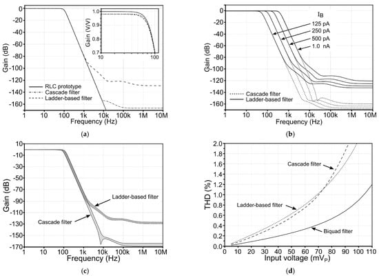 The influence of fabrication process spread and the mismatch of the filter components is illustrated in Figure 9c. As can be seen both filters behave similarly. The changes in the passband gain are insignificant, whereas a 1-sigma deviation in −3-dB frequency is only 4.5 Hz. Details of the filter performance under process-voltage-temperature (PVT) variations are provided in Appendix A.