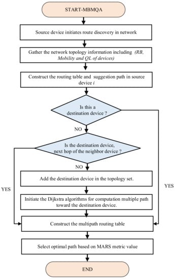 where W is the weight obtained by AHP among the device’s selection criteria according to the user’s preferences. The devices with higher MARS metric values are shortlisted for selecting an optimal path for source-destination pairs. The computation steps of the MBMQA scheme is illustrated in Algorithm 1. In order to arrange the destination, the Multipath Dijkstra algorithm has been utilized for the purpose of the route discovery process and computing the multi-path between the source and destination pair []. The MQA routing scheme, described with a flow chart, is presented in Figure 2.