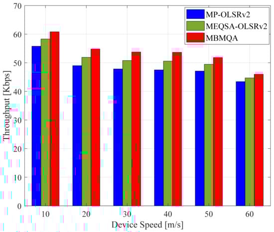 Figure 4 illustrates the throughput of the MBMQA approach with respect to the speed of devices. The obtained results indicated that the proposed approach has outperformed the other approaches. It can be observed from the figure that the overall throughput with all the stated schemes slightly reduced through an increase in the speed of the nodes. This is attributed to the increase in the difficulty of finding a stable route in cases where the node speed is high. The superiority of the proposed MBMQA scheme as compared to both MP-OLSRv2 and MEQSA-OLSRv2 lies in the back-pressure algorithm employed, which does not solely rely on the speed and battery levels of the nodes when making routing decisions but caters to the queue length of packets (commodities) as well in order to be processed by each node. The incorrect selection of nodes based solely on the speed and battery level will force the nodes to be part of the route, which results in higher queue length, and nodes will constantly discard the packets when the queue length is full. Avoiding devices with higher queue lengths reduces network traffic, as the load is equally distributed among the devices. Therefore, only nodes with low queue lengths are selected to forward data. This distinction provides leverage to the proposed protocol and enhances throughput compared to both MP-OLSRv2 and MEQSA-OLSRv2. Furthermore, the MBMQA scheme proved to be more stable than its counterparts due to its optimized approach in the selection of multiple relays and avoiding high mobility nodes.