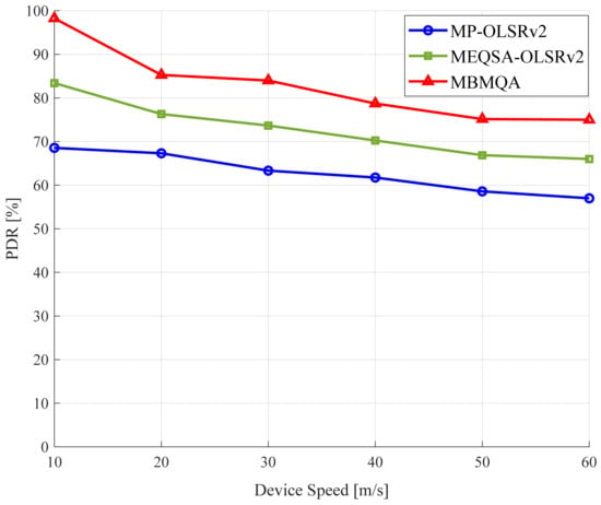 It can be seen from Figure 6 that the MBMQA scheme ensures a high packet delivery ratio (PDR) value over both MP-OLSRv2 and MEQSA-OLSRv2 schemes. This is due to the fact that MBMQA takes advantage of the MARS metric to select devices with a lower energy drain rate and an adequate amount of remaining energy level. Consequently, a reduced amount of retransmission is required to transfer packets from the source to the destination and avoid selecting low-resource devices. In addition, packet delivery is closely related to packets dropped by either low energy level nodes or packets dropped due to the full queue of nodes participating in multiple forwarding of packets. Therefore, the proposed scheme is shown to provide optimum results in delivering packets to the destination, since a limited number of packets dropped. Moreover, as the speed of devices increases, maintaining connections with neighboring nodes becomes difficult, while that is the next hop for data forwarding. Furthermore, in order to forward packets to the next hop, the device needs to select another candidate for the successful transmission of the packet while fulfilling the requirements of the MARS metric. Based on the results obtained, the MBMQA scheme delivered approximately 30% more packets than MP-OLSRv2 and approximately 15% to 20% more than MEQSA-OLSRv2.