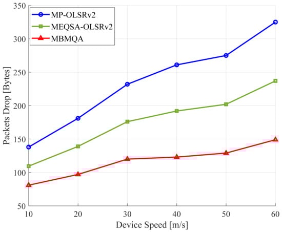 The results illustrated in Figure 7 indicate that the MBMQA possesses the lowest packet drop percentage compared to the other schemes (i.e., 55% lower than MP-OLSRv2 and 35% lower compared to MEQSA-OLSRv2) at the 60 m/s speed of the device. The higher number of packets dropped in other schemes is due to the absence of the backlog queue length awareness of devices for selecting the best route. In contrast, the MBMQA routing scheme intelligently selects devices with a lower queue length to reduce the chance of traffic overhead and packet drop.