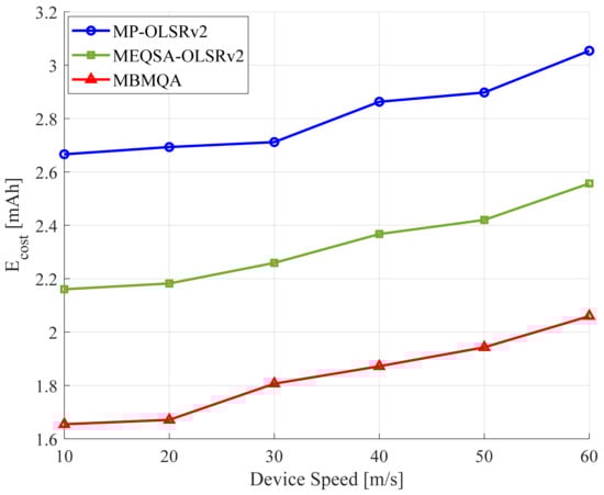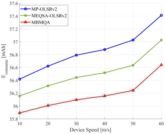 Similarly, the overall power or energy consumed by the network is minimized, as low power is required to transmit a single bit from source to destination, as depicted in Figure 9. Furthermore, BP reduced load congestion occurring in the path and further reduced the device drain rate. As the device speed increases, the energy consumption of devices increases. Energy consumption increases from approximately 56.43 mAh to 57.42 mAh for MP-OLSRv2, from 56.18 mAh to 57.13 mAh for MEQSA-OLSRv2, and from 55.86 mAh to 56.62 mAh for MBMQA routing schemes when device speed increases from 10 m/s to 60 m/s. As seen from Figure 9, it can be observed that MBMQA can consume less battery energy compared to MP-OLSRv2 and MEQSA-OLSRv2 in all device speed scenarios because the source device forwards traffic flow towards intermediate devices which have the highest energy level and lowest drain rate.