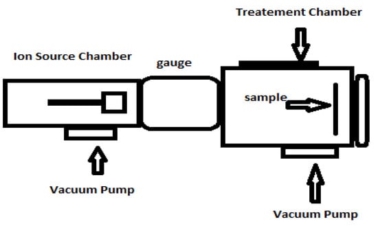 The schematic diagram of the experimental process is shown in Figure 1. It consists of an ion source chamber, a vacuum pump integrated into the treatment chamber through a gauge, and a secondary vacuum pump underneath the treatment chamber. In this preparation stage, tantalum has been used as a substrate for producing the samples with argon ion implantation at various doses. The impact of corrosion has been studied on the surface samples by using AFM and SEM analyses. In addition, the change in corrosion resistance and surface roughness have been investigated.